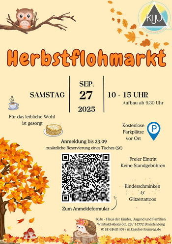 Hej,Hej! und aufgepasst: Der traditionelle Herbstflohmarkt auf dem KiJu-Campus findet am 27. September 2025 von 10 bis 15 Uhr statt (Aufbau ab 09.30 Uhr). Und hier die Einzelheiten: Neben dem fröhlichen Geschachere gibt es Kinderüberraschungen und auch für das leibliche Wohl wird bestens gesorgt. Der Eintritt sowie die Standgebühren sind kostenfrei. Auch kostenlose Parkplätze stehen direkt am KiJu-Campus zur Verfügung. Eigene Tische können gerne mitgebracht werden. Alternativ sind Tischreservierungen möglich (5€ pro Tisch einer Bierzeltgarnitur).