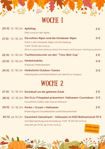 Vom 20. bis 31. Oktober 2025 bietet das KiJu – Haus der Kinder, Jugend und Familien - ein abwechslungsreiches Herbstferienprogramm unter dem Motto „Windspiele 2025“ an. In den zwei Wochen stehen unter anderem der Apfeltag, ein Ausflug in die Glindower Alpen, kreative Bastelangebote wie Herbstmobiles, Kürbisschnitzen, Halloweenmasken basteln sowie sportliche Aktionen und Filmnachmittage auf dem Programm. Ein besonderes Highlight ist die Halloweenparty im KiEZ Bollmannsruh mit Übernachtung und Gruselfaktor pur. Die Kosten variieren je nach Angebot zwischen 0 € und 10 €. Anmeldungen und weitere Informationen gibt es direkt im KiJu, Willibald-Alexis-Straße 28, 14772 Brandenburg, Telefon 03381 730382 oder per Mail an kiju-club@humreg.de.